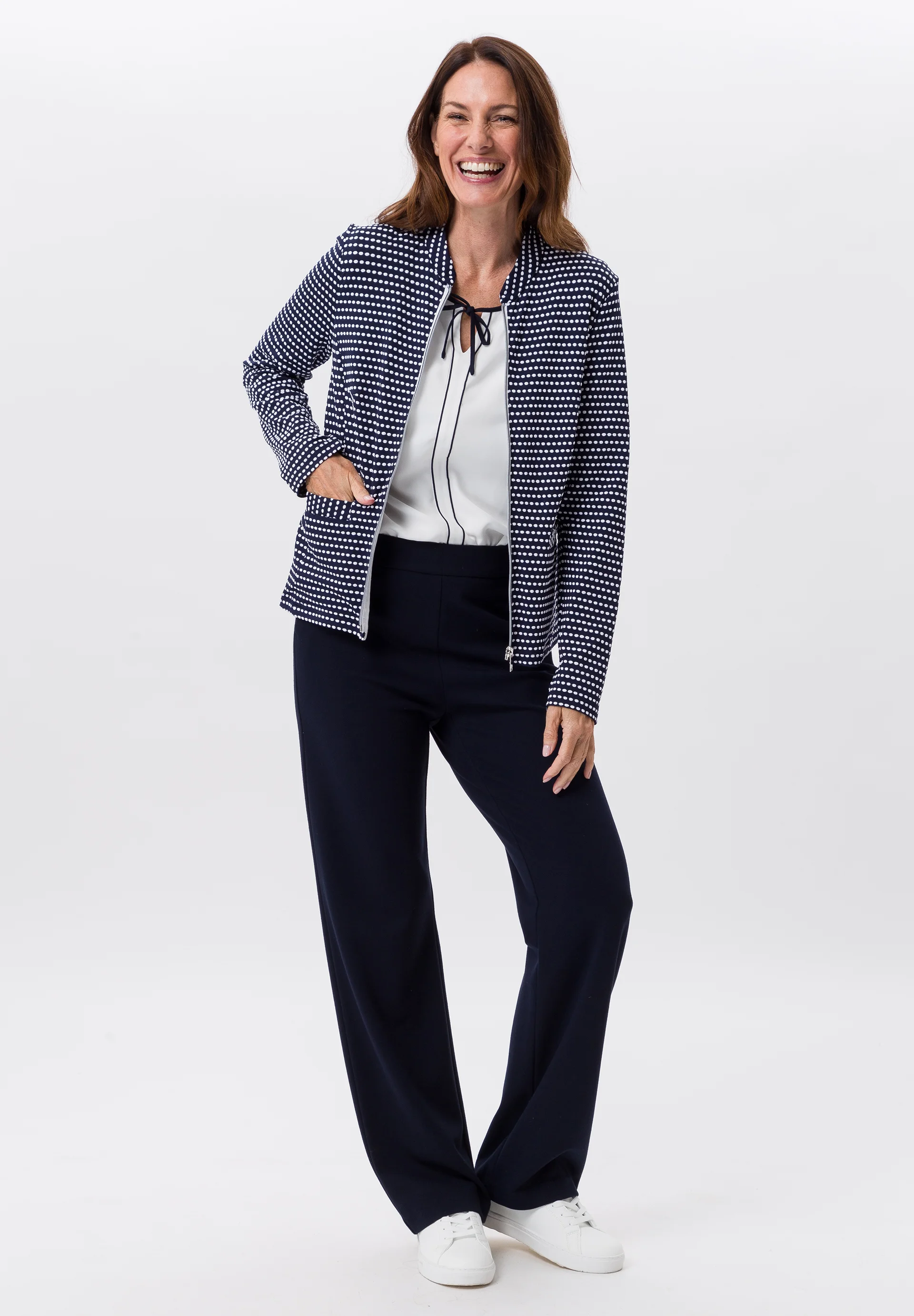 Gerade geschnittene Hosen: Sie strecken optisch und lassen die Beine schlanker wirken. Modelle mit Regular Fit umspielen die Oberschenkel, ohne aufzutragen. Unsere FRANK WALDER Hose BRENDA etwa hat einen geraden Beinverlauf und eine angenehm schmale Oberschenkelpartie – perfekt für einen schmeichelhaften Sitz.