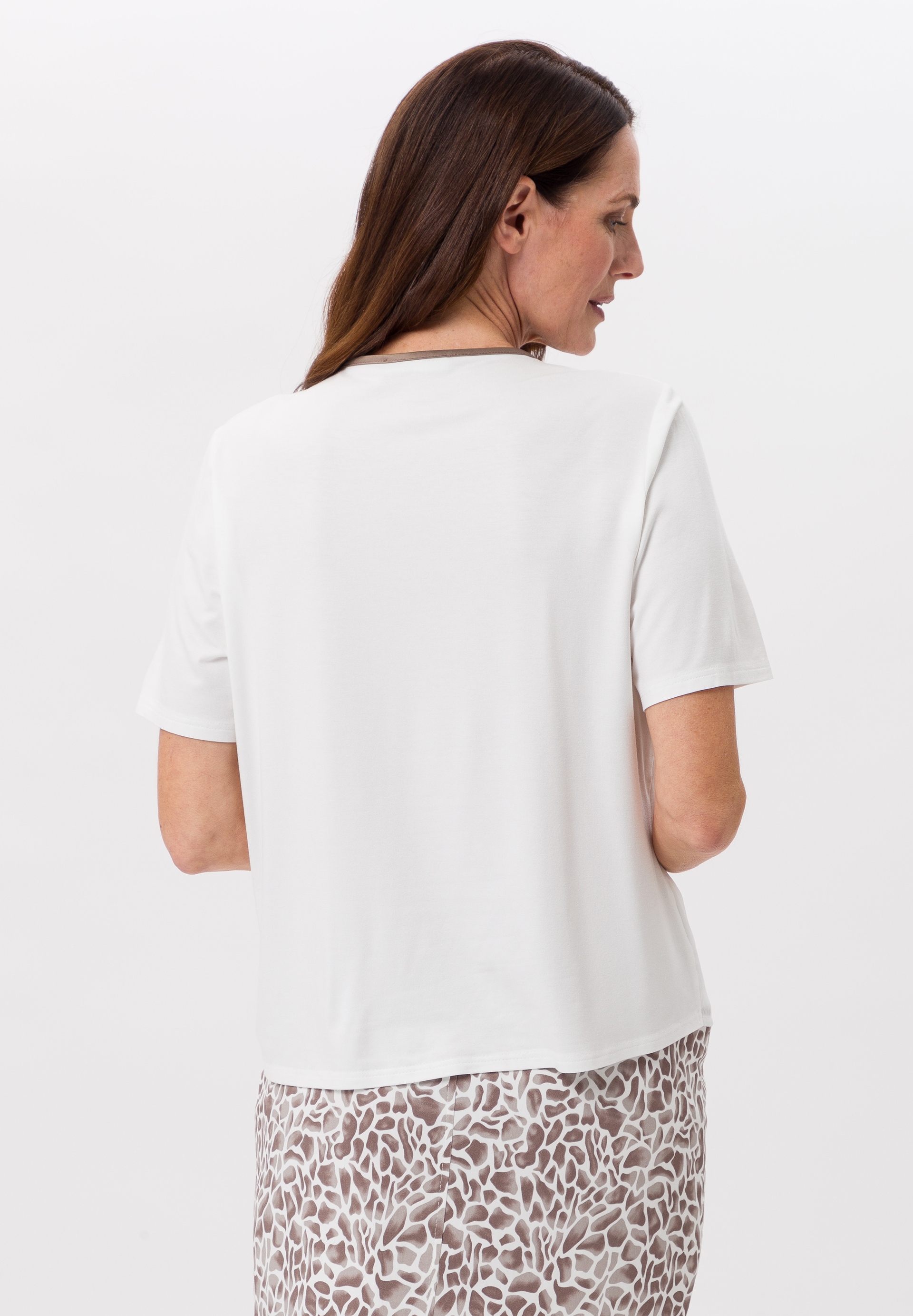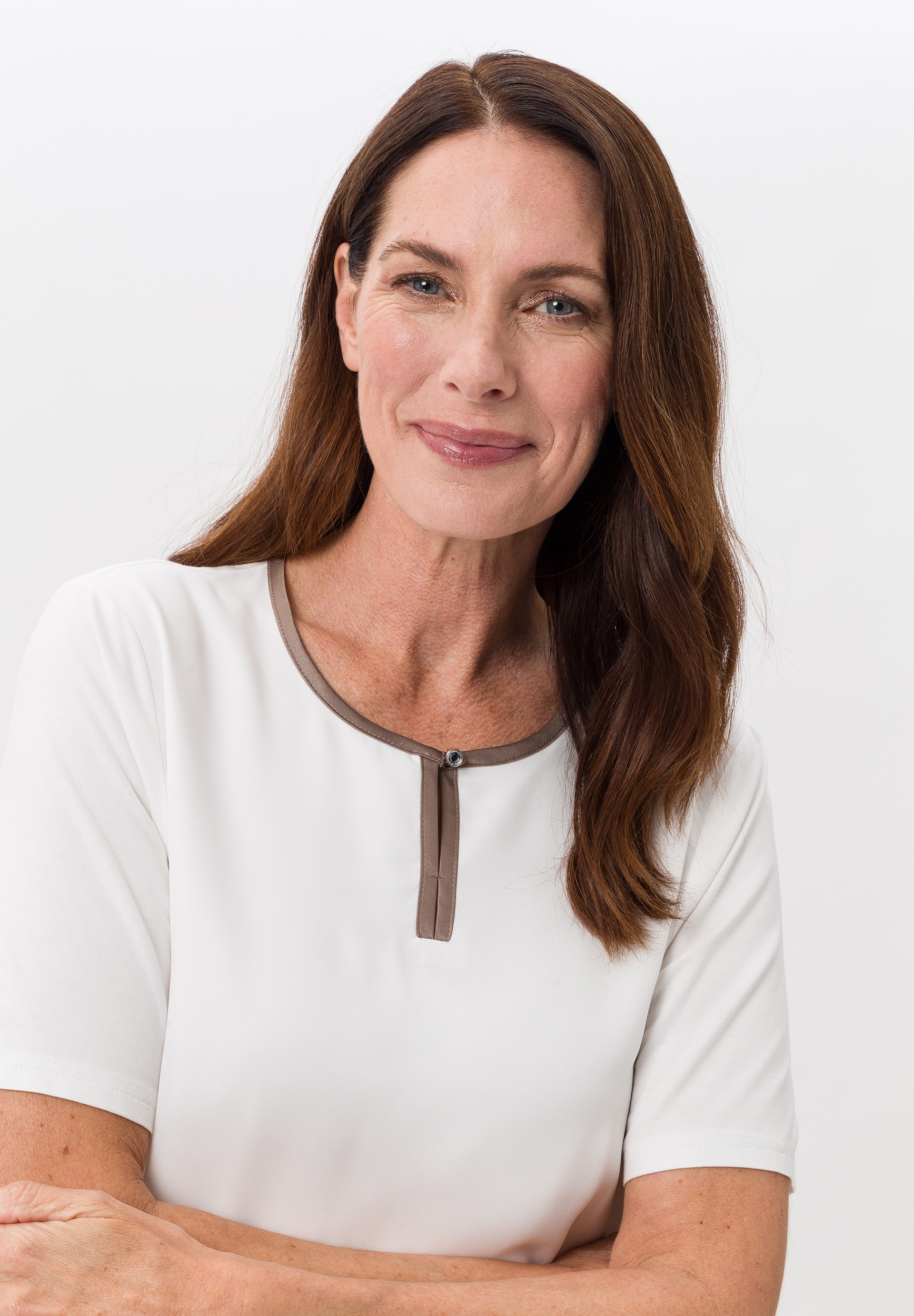 Modisch chic und mit besonderem Flair. Blusenshirt mit paspeliertem Rundhals und kleinem Schlitz in Satinoptik. Abgerundet mit einem kleinen dekorativen Schmuckknopf.