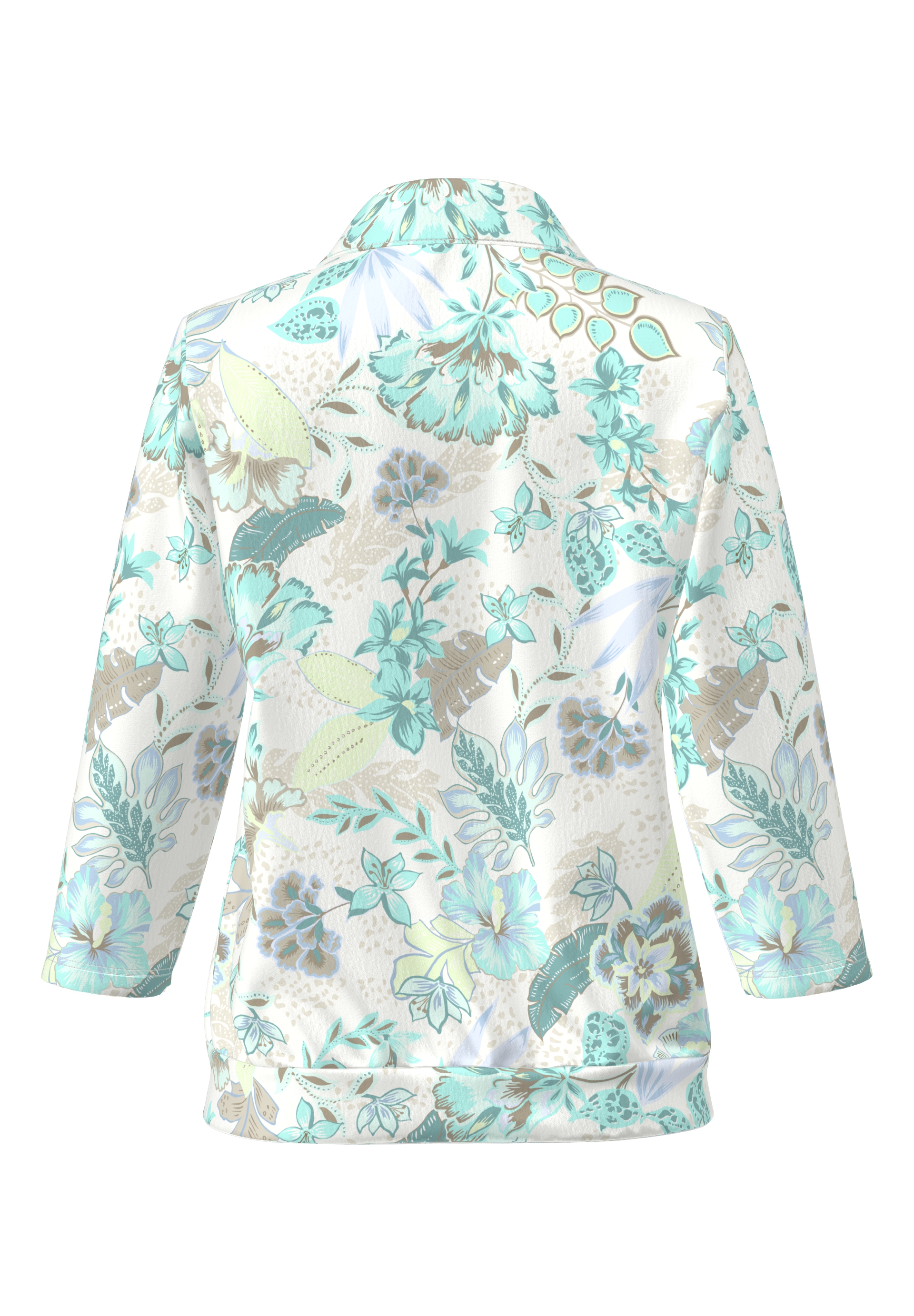 Das Shirt hat einen klassischen Schnitt mit 3/4-Ärmeln, einem Kragen und einer Knopfleiste. Es besteht aus leichtem, bequemem Material und ist durch das detailreiche Muster ein modischer Hingucker. Ideal für elegante und legere Looks.