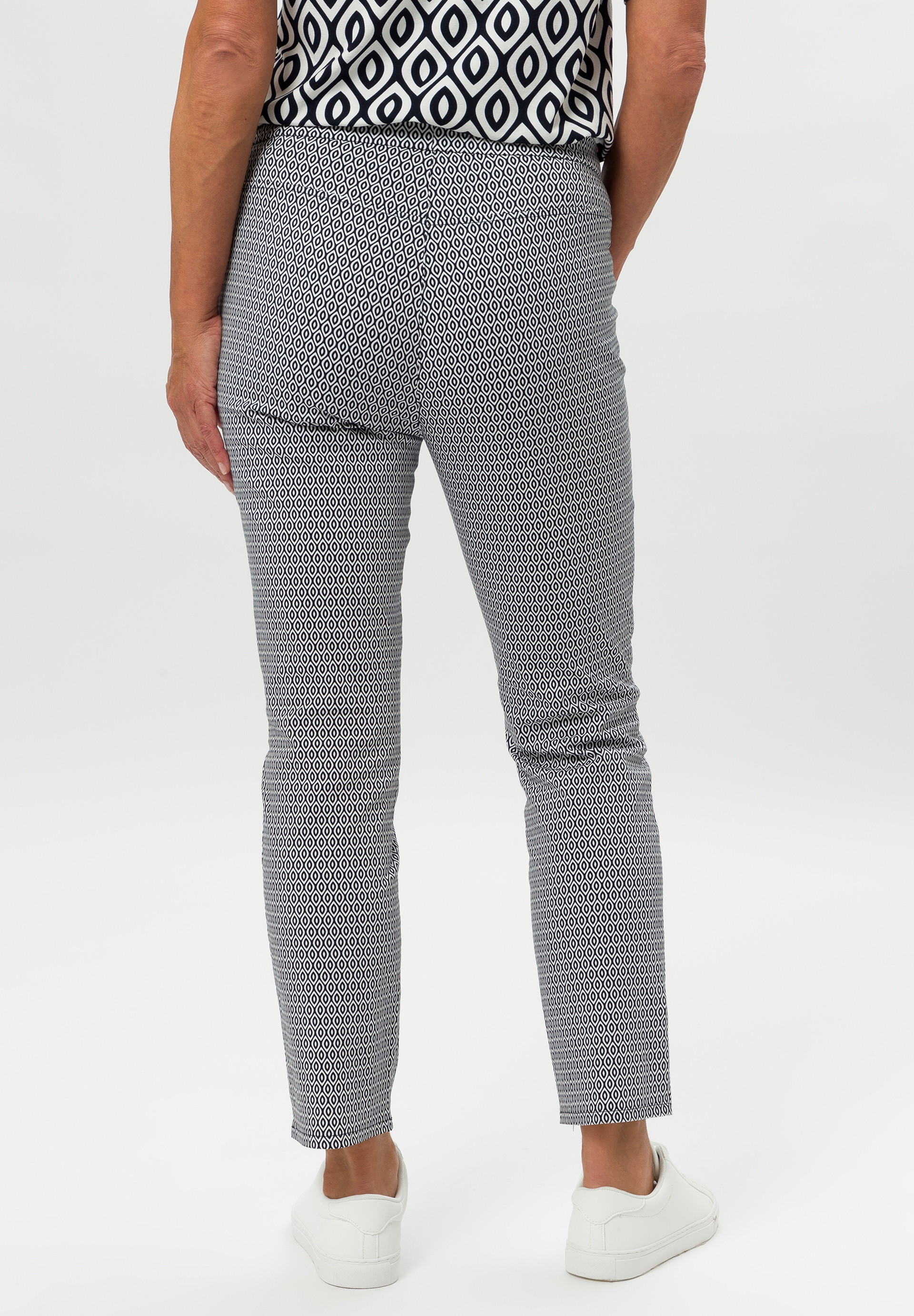 Diese Hose bietet einen modernen Look mit dynamischem Allover-Muster. Der schmale Schnitt und elastische Bund sorgen für angenehmen Tragekomfort und betonen die Figur. Perfekt kombinierbar für Büro und Freizeit.