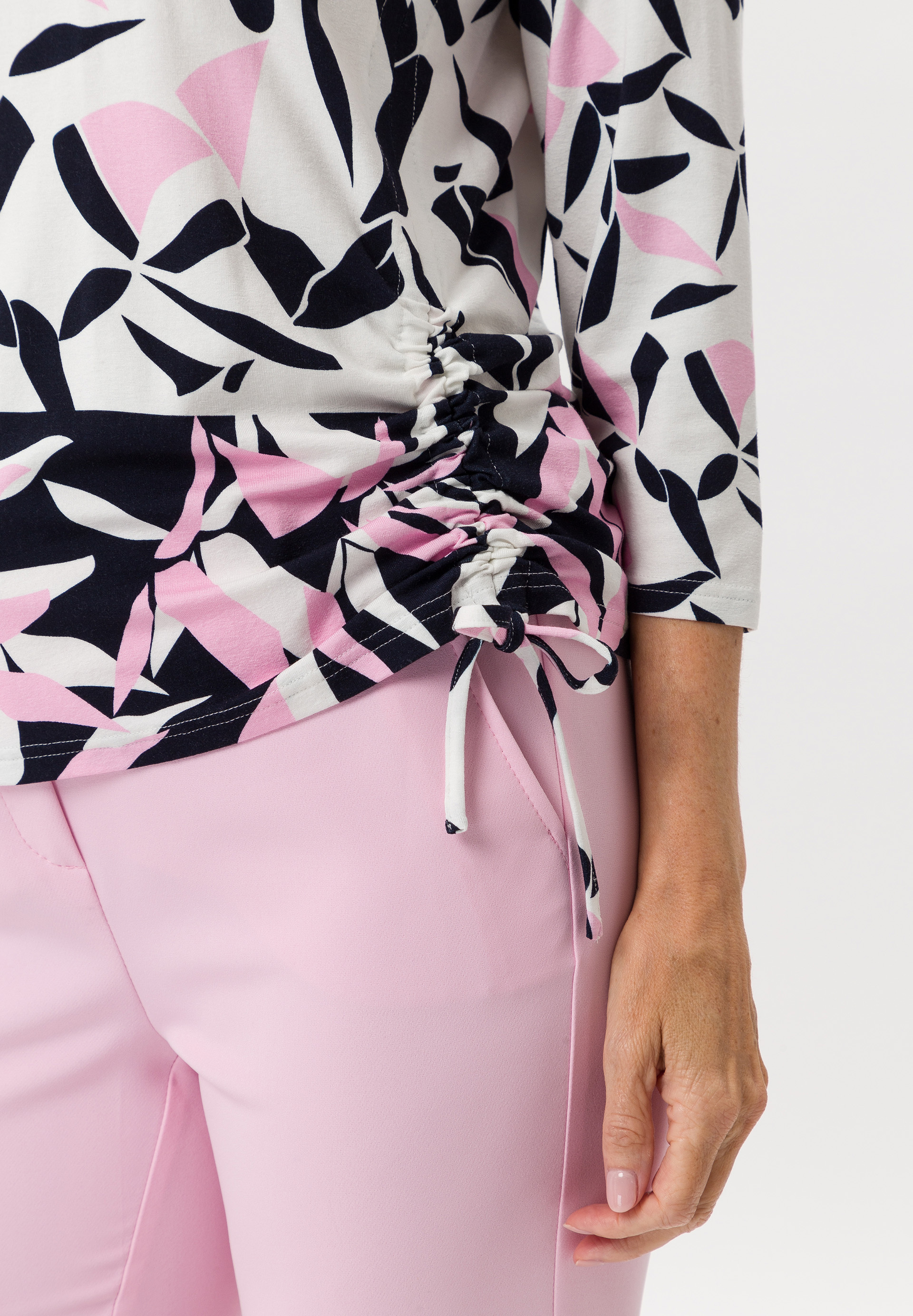 Das Shirt besticht durch einen stilvollen Allover-Print und eine seitliche Raffung mit Band, die für eine figurbetonte Silhouette sorgt. Mit seinem klassischen Rundhalsausschnitt und den 3/4-Ärmeln eignet sich das Oberteil ideal für vielseitige Outfits