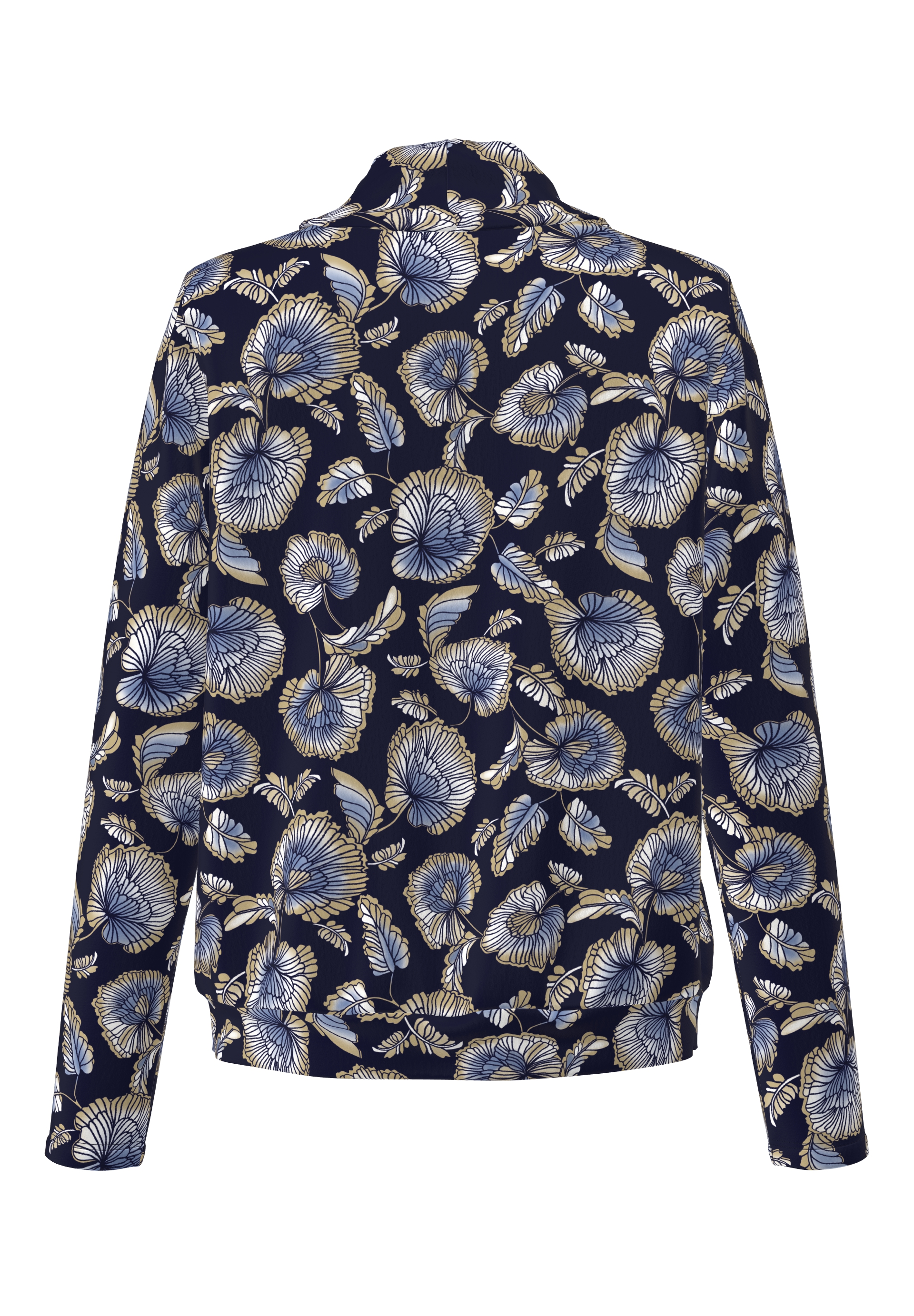 Dieses Damen-Shirt vereint Eleganz mit Komfort. Der feminine Rollkragen und das einzigartige Blütenmuster auf inkfarbenem Hintergrund verleihen jedem Outfit einen besonderen Touch. Gefertigt aus pflegeleichtem Viskose-Jersey, verspricht dieses Shirt angenehmen Tragekomfort und eine perfekte Passform.