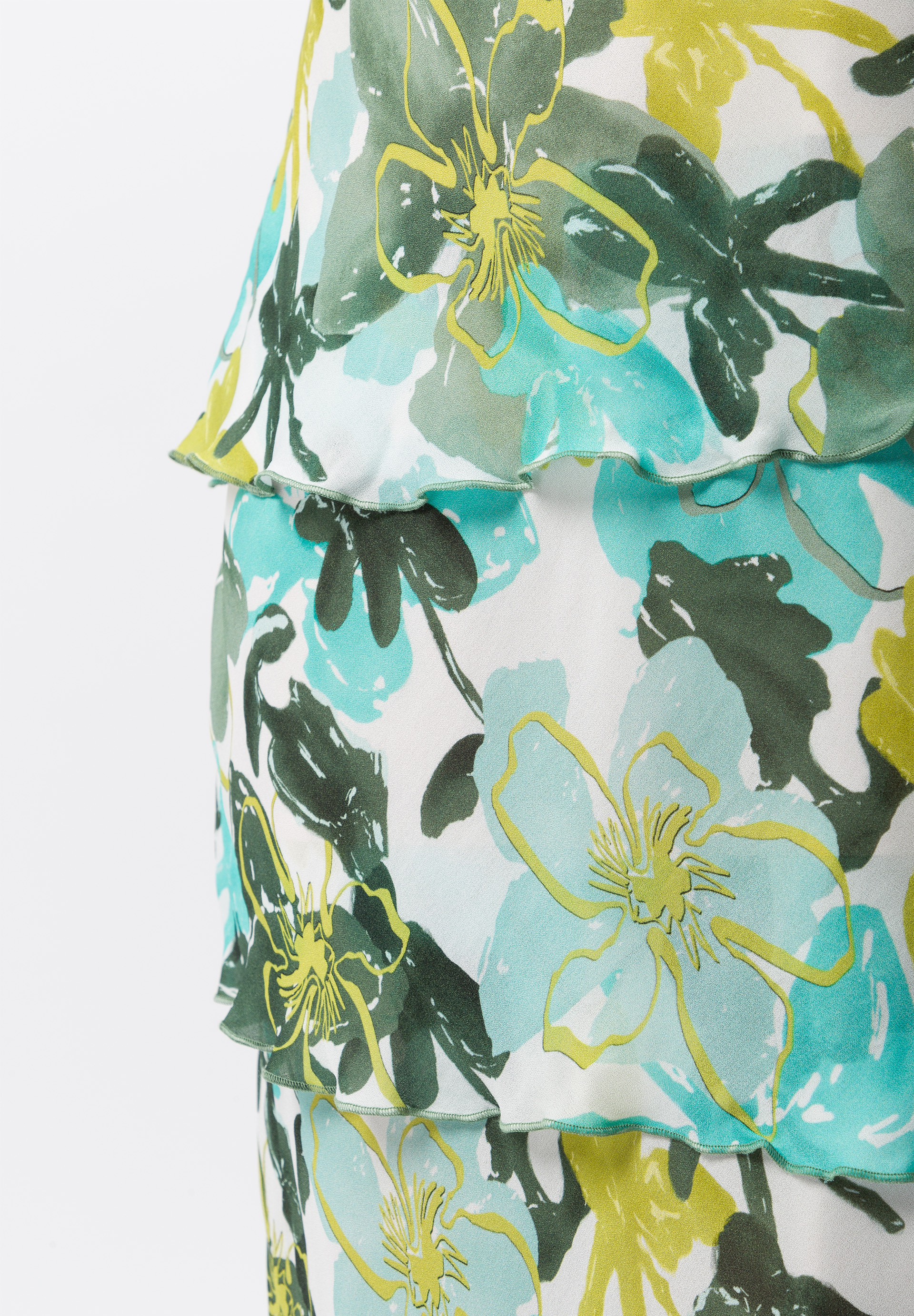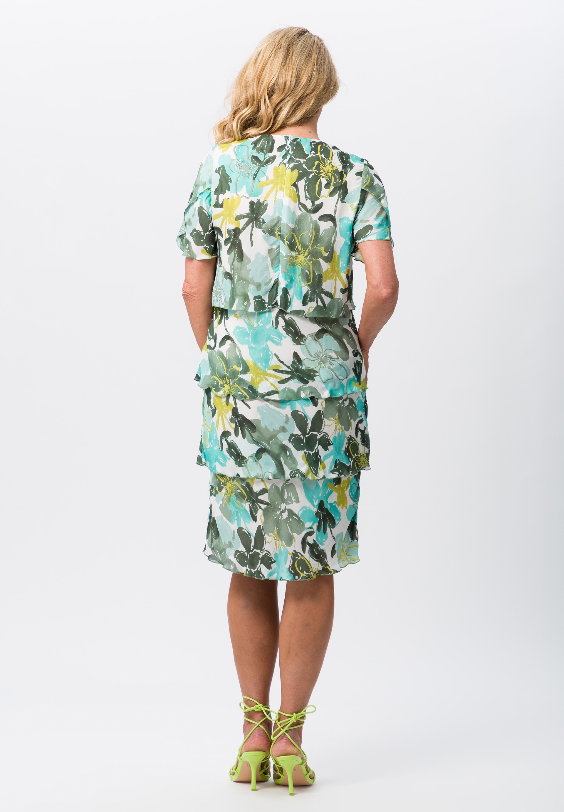 Erleben Sie den Zauber des Sommers mit unserem Stufenkleid, das Ihre Silhouette gekonnt in Szene setzt. Aus atmungsaktivem Viskose mit einem verspielten Blumenmuster gefertigt, verbindet dieses kniebedeckende Kleid mit Halbarm und femininem V-Ausschnitt Komfort mit Eleganz.