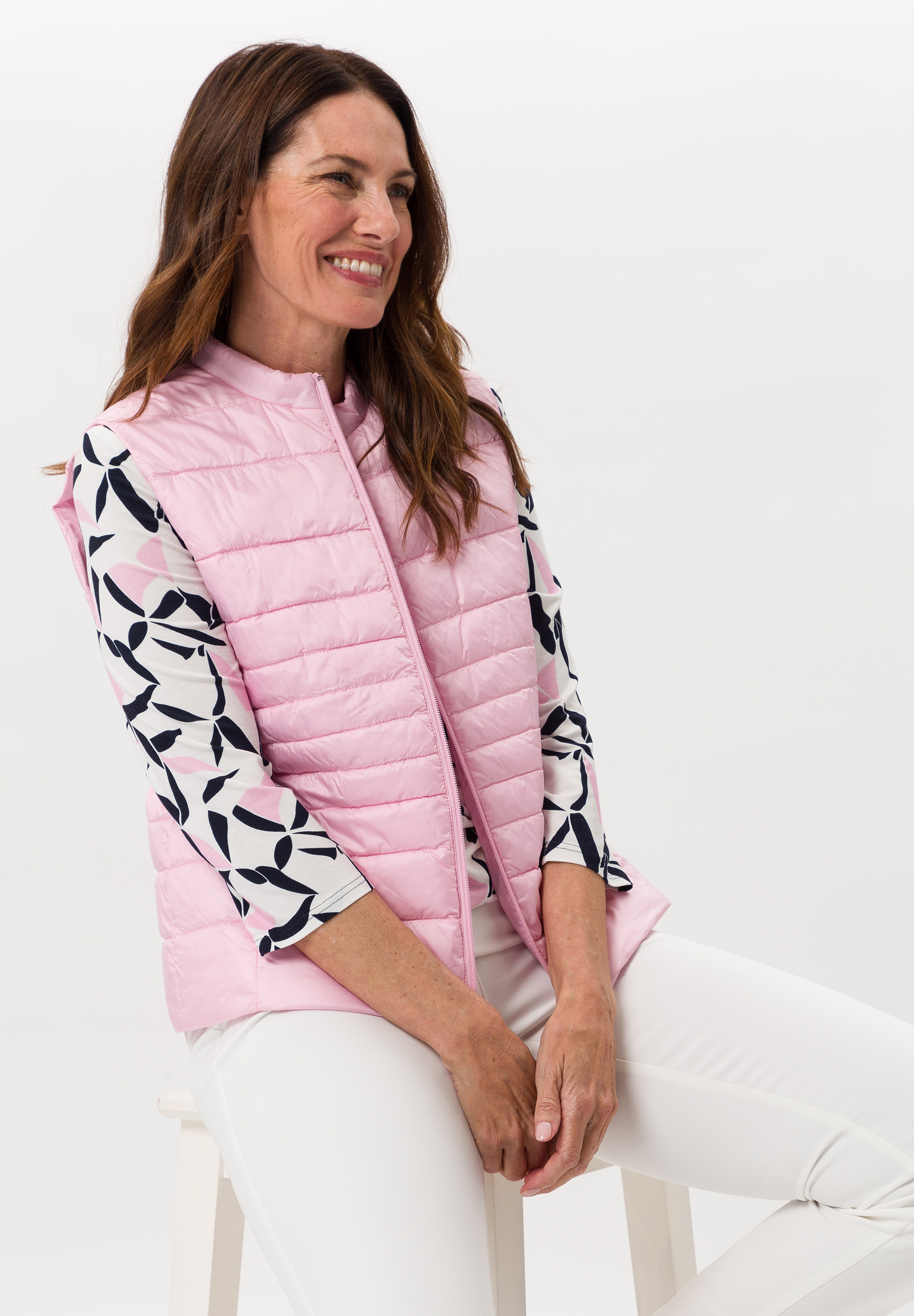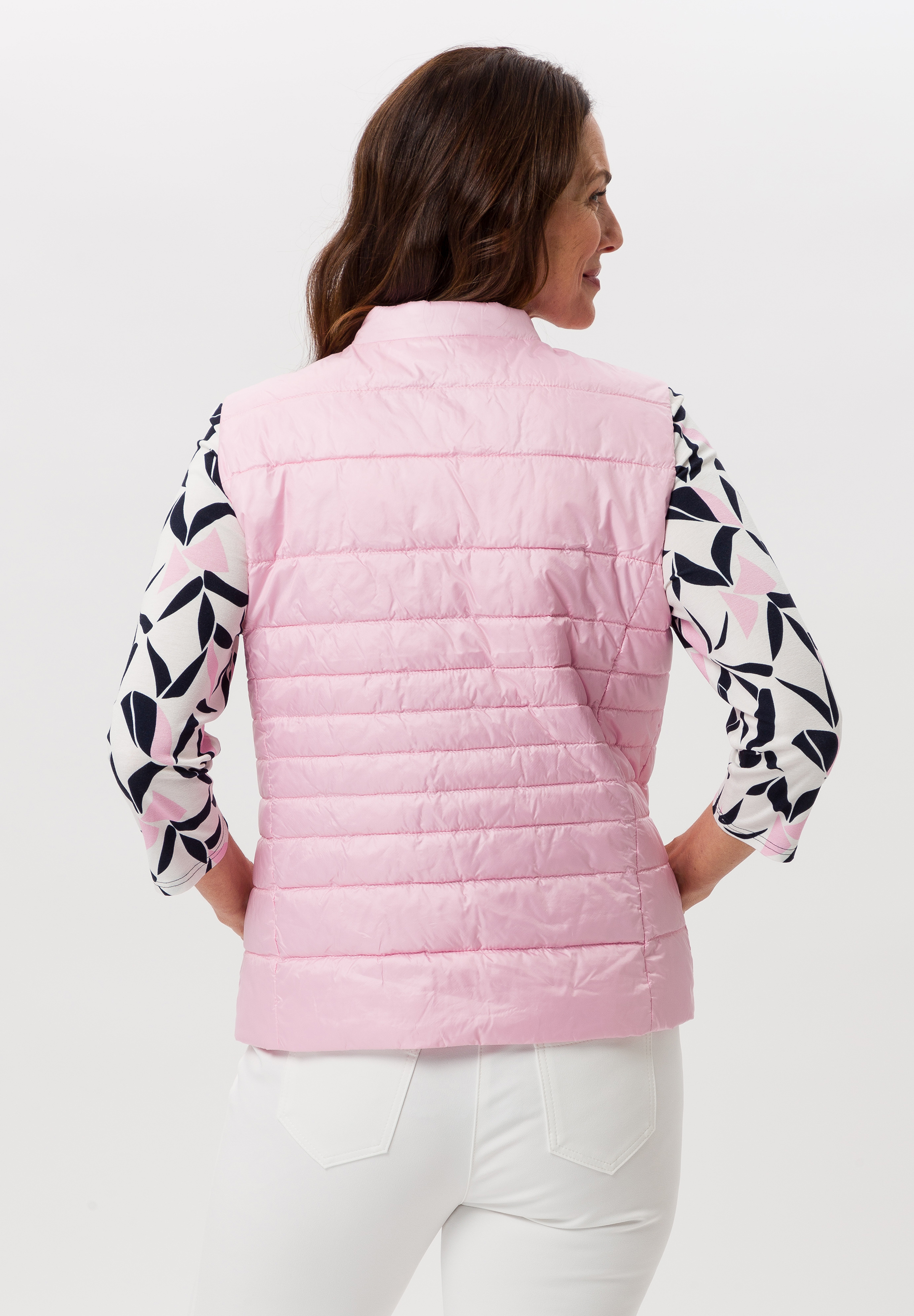 Steppweste mit durchgehendem Reißverschluss und Stehkragen. Leichte Wattierung für angenehmen Tragekomfort.