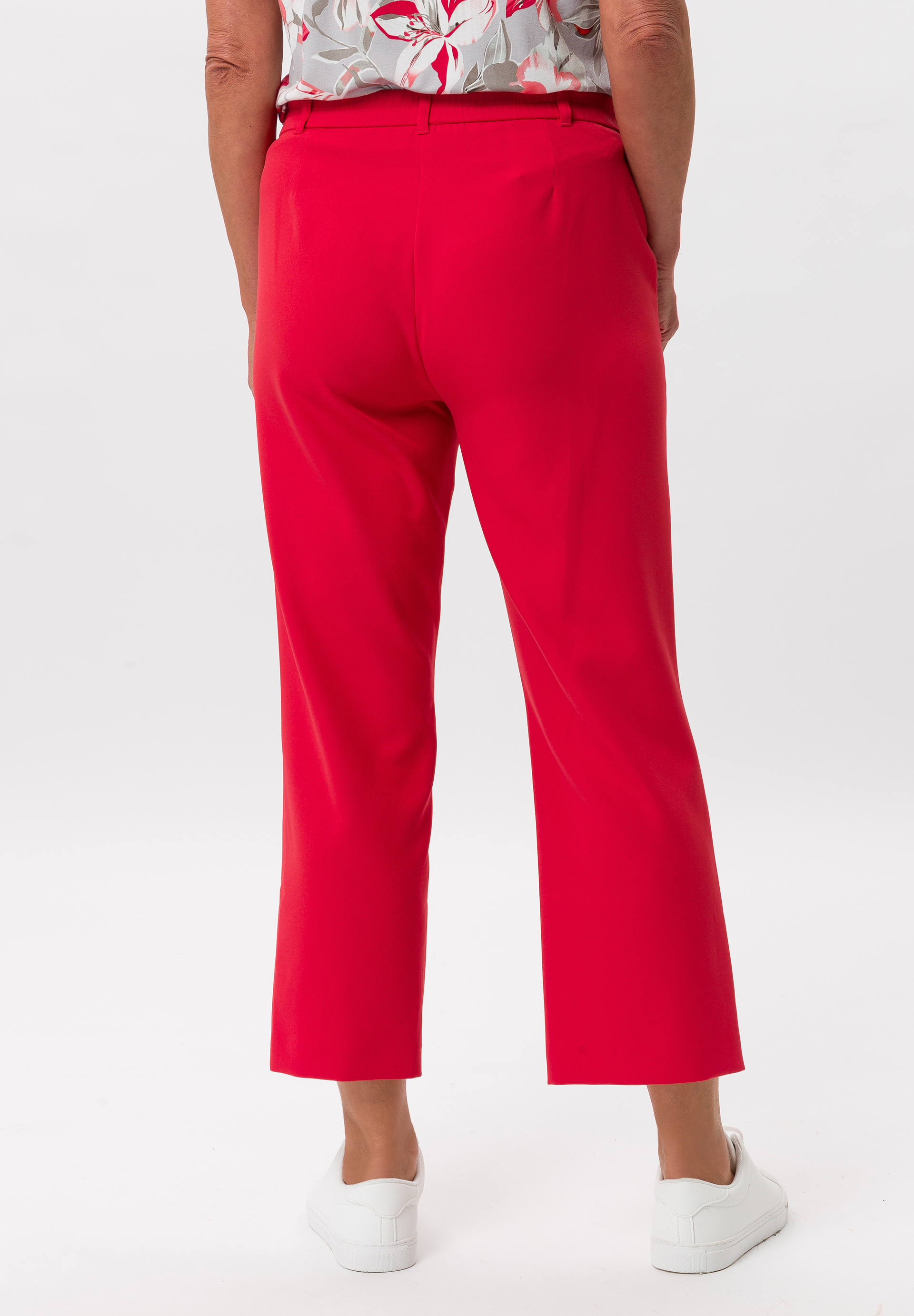 Feminine 3/4-length women's trousers with an elaborate waistband and practical slit pockets. With a concealed hook fastening and zip at the front and an elasticated waistband at the back, they offer plenty of comfort and are made from high-quality pes stretch material