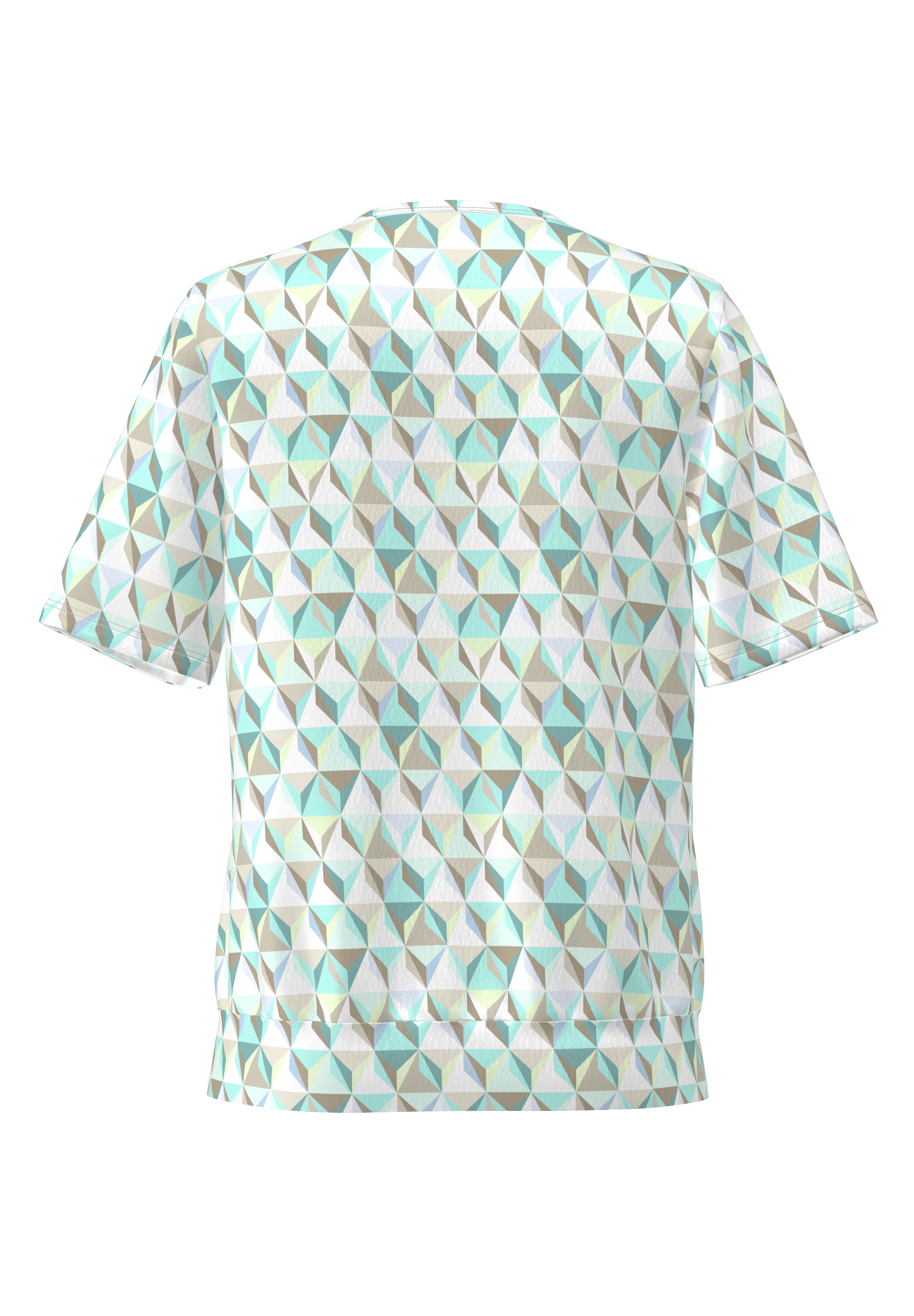 Fashionable blouse shirt with an elegant pattern and lightweight, flowing fabric. Round neckline with a delicate pleat at the front for a flattering fit. Comfortable, loose fit with elasticated waistband for a perfect fit
