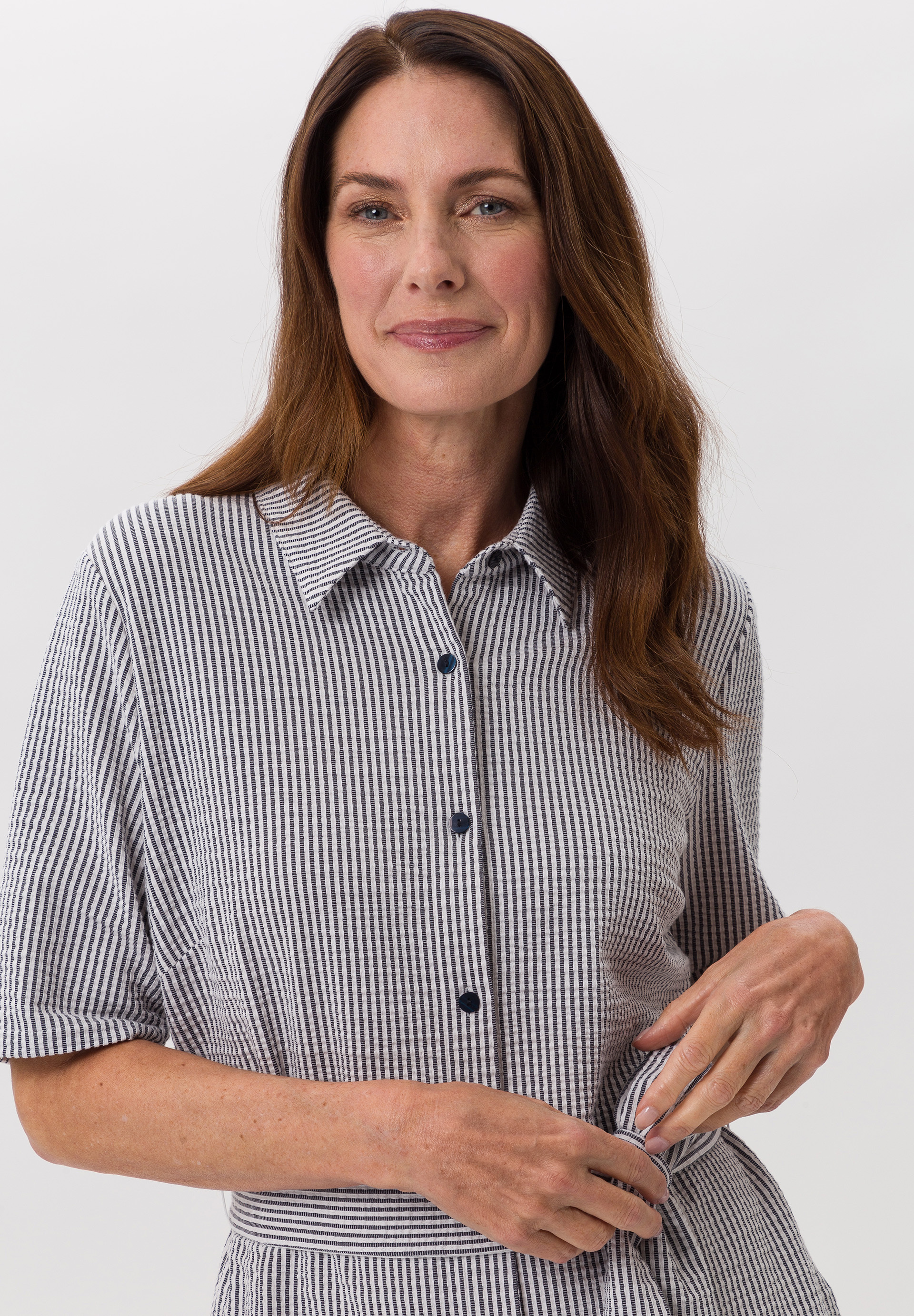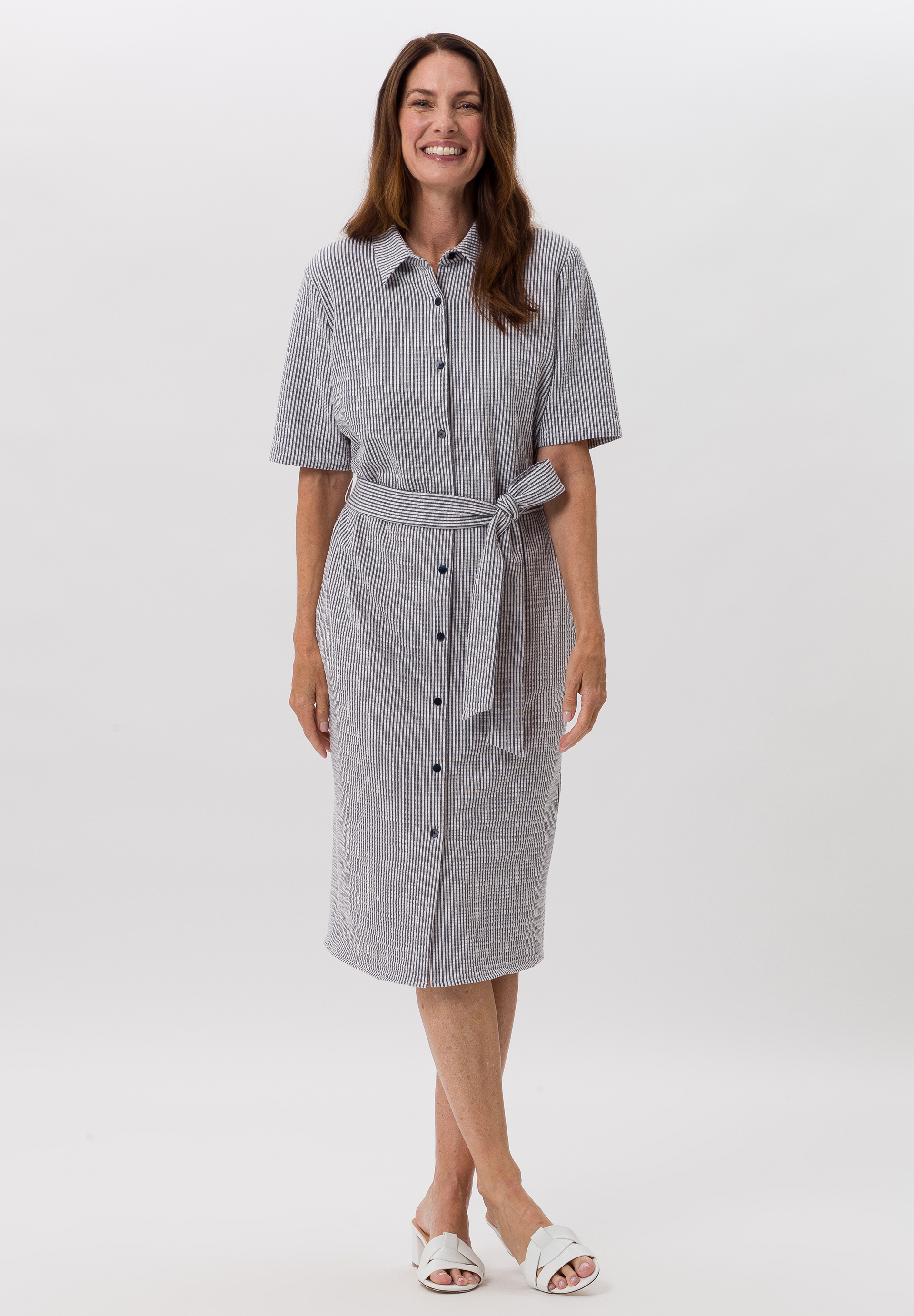 Classic cut shirt dress made of two-coloured seersucker and detachable tie belt. Featuring a decorative button placket and the typical collar. Thanks to its high elasticity, it follows your every move.