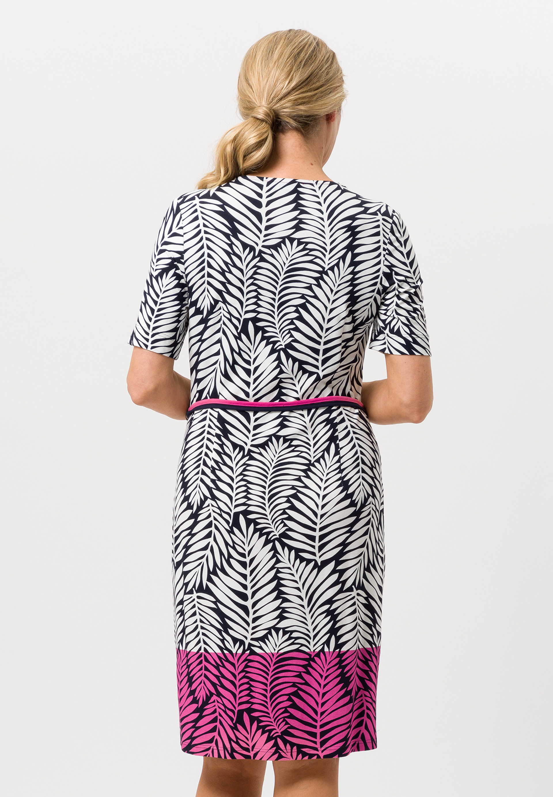 Discover our feminine jersey dress with a summery print and contrasting hemline that will enrich your summer wardrobe. Made from crease-resistant viscose, this knee-length dress with a slit round neck and half sleeves offers a casual yet flattering cut. The soft material flatters every figure and its unlined, lightweight comfort makes it ideal for a variety of occasions, from summer parties to a stroll through town.