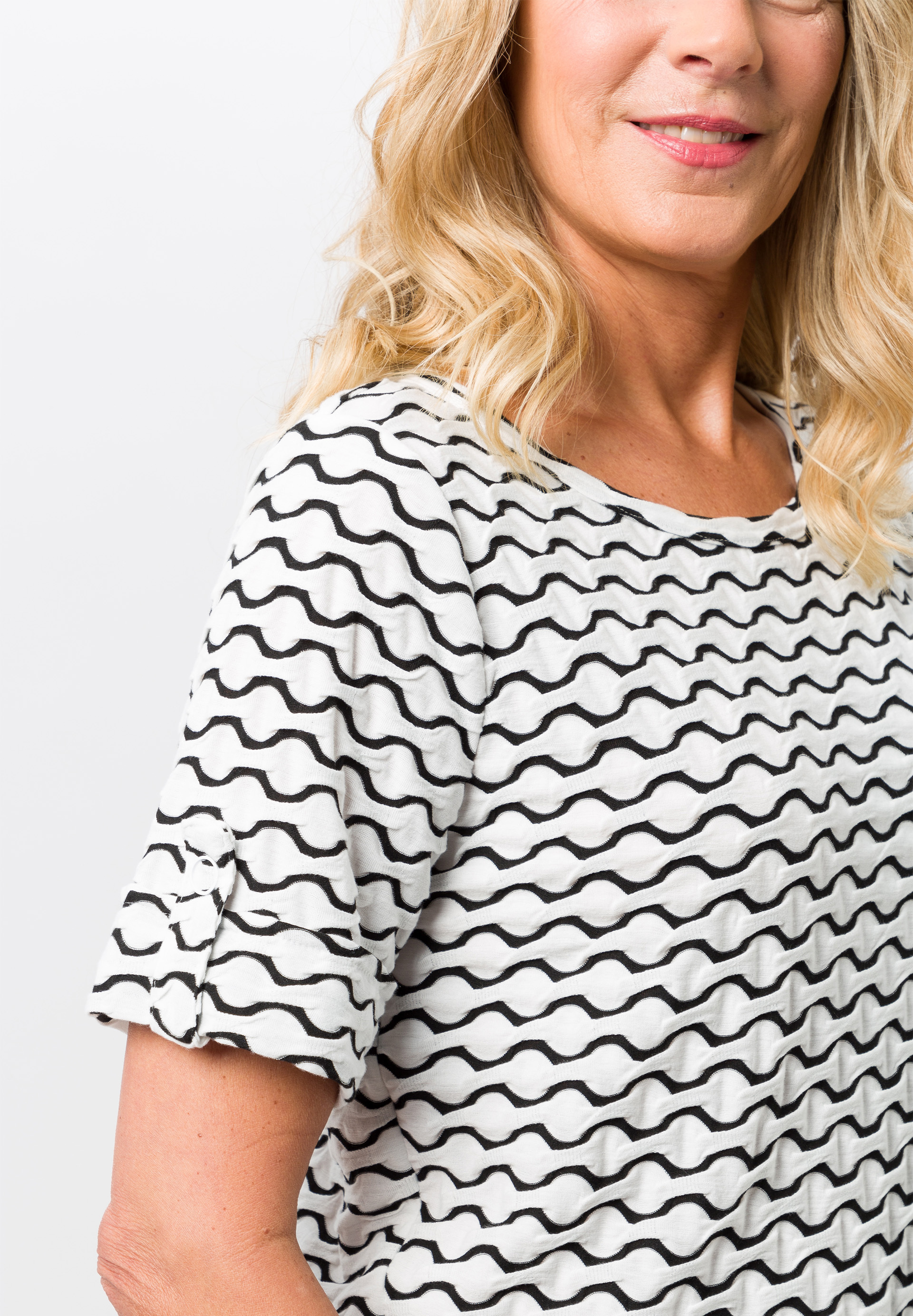 Our women's shirt combines stylish elegance with a comfortable feel. Made from a viscose-blend fancy jersey, it offers a perfect fit that skims the figure without constricting. The piped round neck and half sleeves give the shirt a feminine touch, ideal for a variety of occasions. The elegant textured fabric with subtle accents creates a summery look.