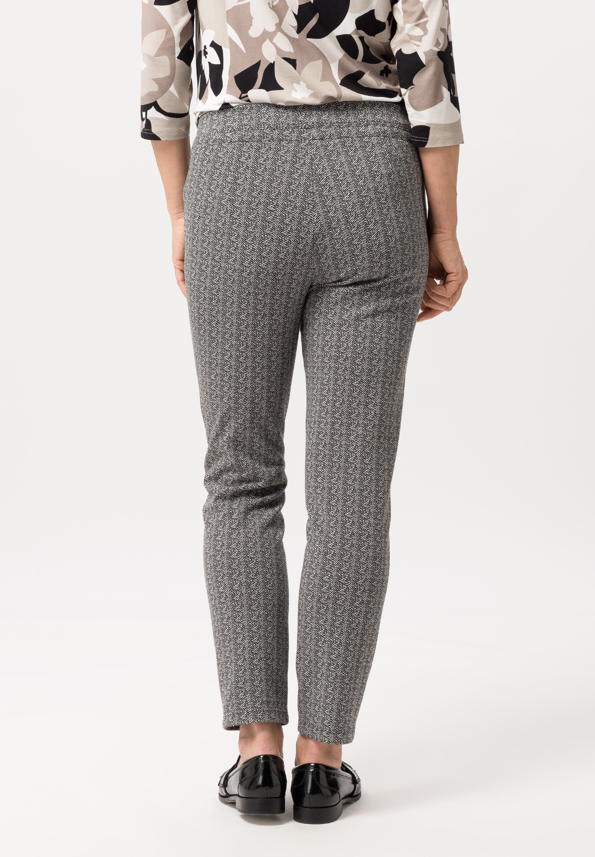 These women's slip-on trousers combine comfort with a modern design. The fashionable fancy jersey in a herringbone look and the elasticated comfort waistband ensure a comfortable fit. Practical slit pockets and details such as eyelets, a drawstring and cord ends complete the modern cut. The PES blend fancy jersey material offers outstanding comfort and is easy to care for. Ideal for all occasions and perfect for mixing and matching.