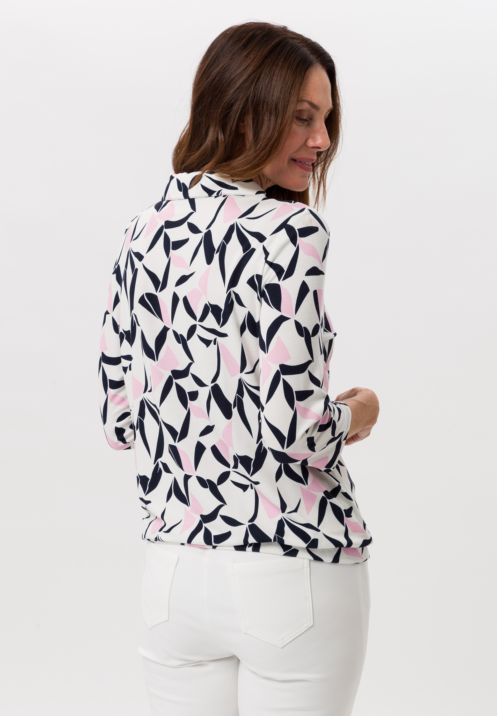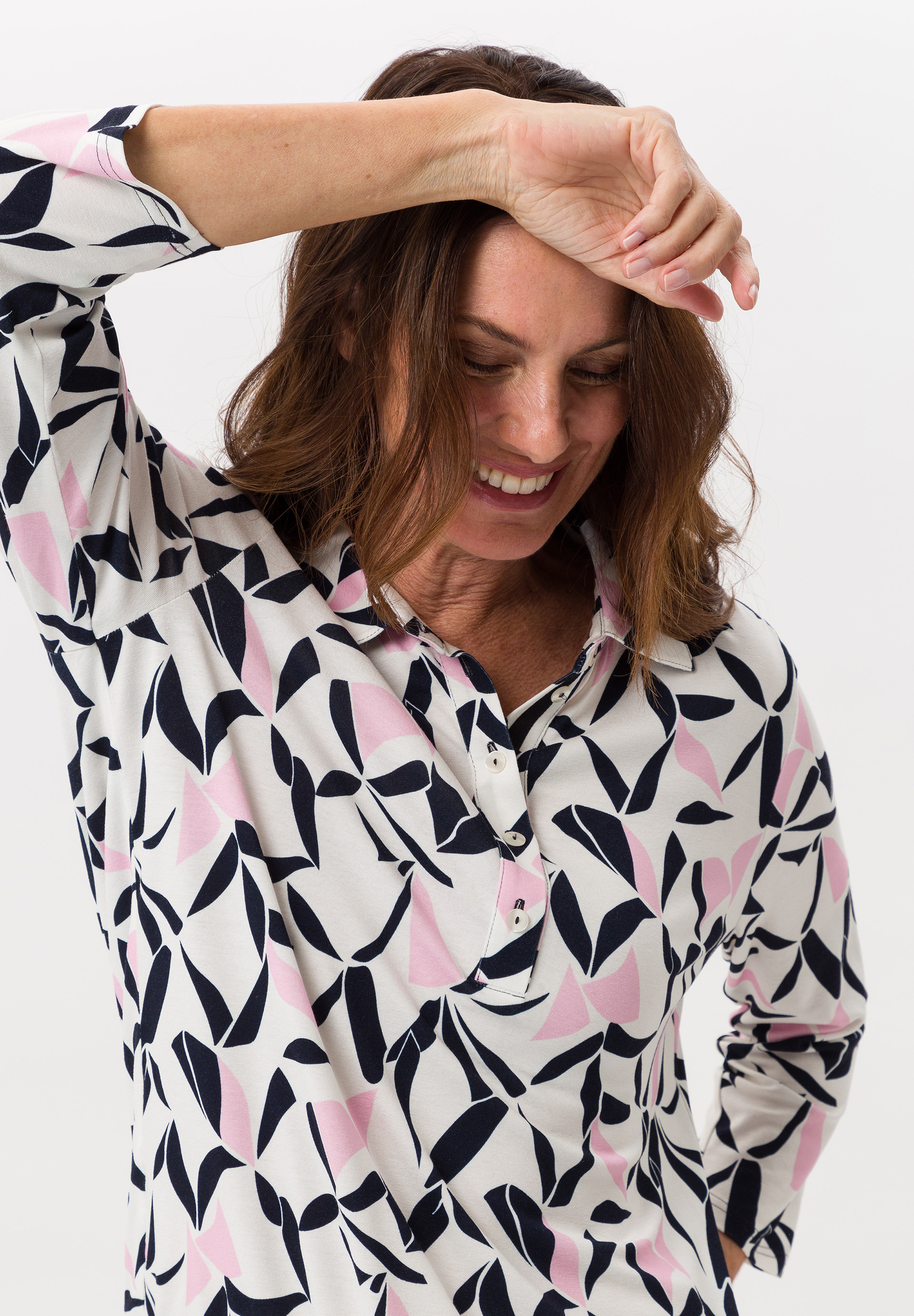 This shirt made from flowing material features 3/4-length sleeves, a polo collar and button placket. The rounded hem and elasticated waistband ensure a comfortable fit and a modern look. Ideal for casual and stylish looks.
