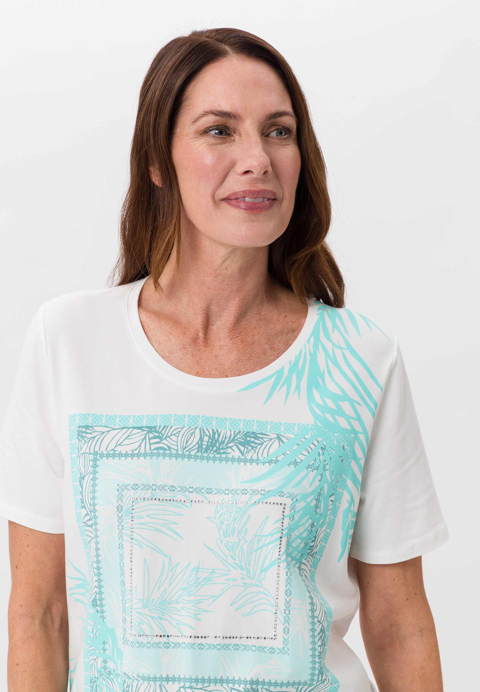This shirt is pure summer! Front with motif print and subtle rhinestones, feminine piped neckline and half sleeves. The soft, blended cotton fabric is extremely comfortable to wear.