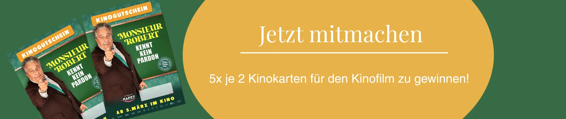 Gewinnen Sie 5x je 2 Tickets für den Kinofilm "Monsieur Robert kennt kein Pardon1" in einem Kino Ihrer Wahl!