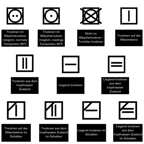Das Quadrat ist das Symbol für die Trocknung. Es werden zwei Arten unterschieden: Trocknung im Wäschetrockner und natürliche Trocknung. Der Kreis im Quadrat bedeutet Trocknung im Wäschetrockner. Die im Kreis enthaltenen Punkte zeigen den Trocknungsprozess an. Symbole mit horizontalen oder vertikalen Strichen im Quadrat (ohne Kreis) geben den natürlichen Trocknungsprozess an. Ein diagonaler Strich weist darauf hin, dass der Artikel nicht der Sonne ausgesetzt werden darf.