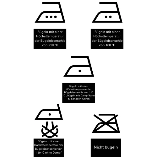 Die Punkte im Bügeleisen-Symbol kennzeichnen die Temperaturbereiche heiß, mäßig oder gar nicht bügeln. Vorsicht ist bei Prägeeffekten oder Applikationen geboten. Bestimmte Artikel (z. B. mit einem Balken unter dem Waschsymbol) dürfen gegebenenfalls, müssen aber nicht gebügelt werden, wenn sie direkt nach dem Schleudern aufgehängt und dabei in Form gezogen oder wenn sie liegend getrocknet werden.