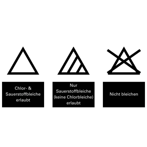 Das Dreieck sagt aus, ob ein Artikel gebleicht werden darf. Das Bleichen ist ein Vorgang, der in einem wässrigen Medium vor, während oder nach der Wäsche zur Verbesserung der Schmutz- und Fleckentfernung und/oder zur Erhöhung des Weißgrades durchgeführt wird. Das geht z.B. mit Aktivchlor (z. B. Javelle-Wasser) oder chlorfreien Aktivsauerstoff abgebenden Produkten (enthalten in Voll- oder Universalwaschmitteln).