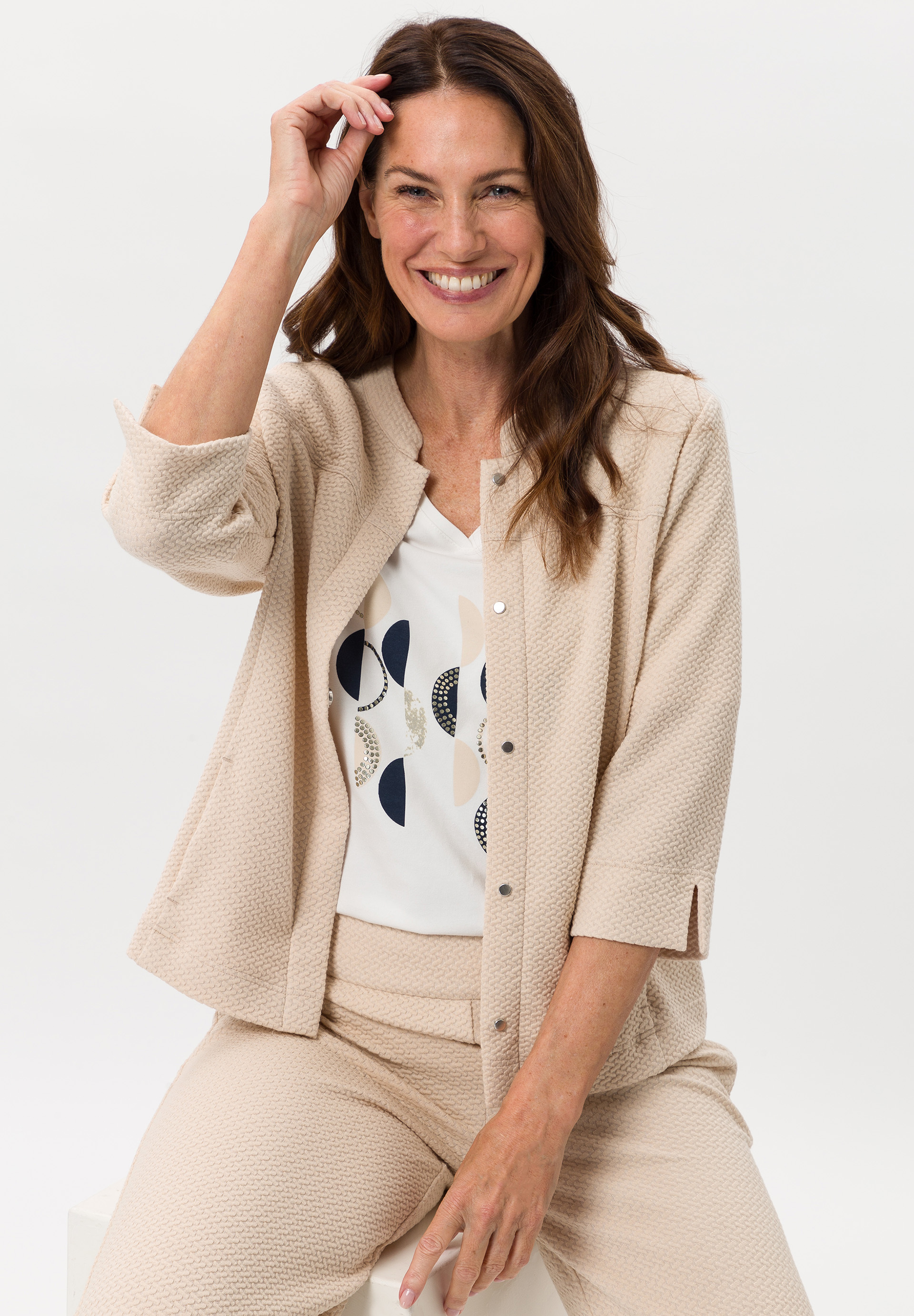 Die Jacke für Damen besticht durch eine strukturierte Optik, 3/4-Ärmel und einen runden Ausschnitt. Ein verdeckter Verschluss vorne sorgt für ein schlichtes Design. Die taillierte Form und seitliche Taschen runden den eleganten Look ab