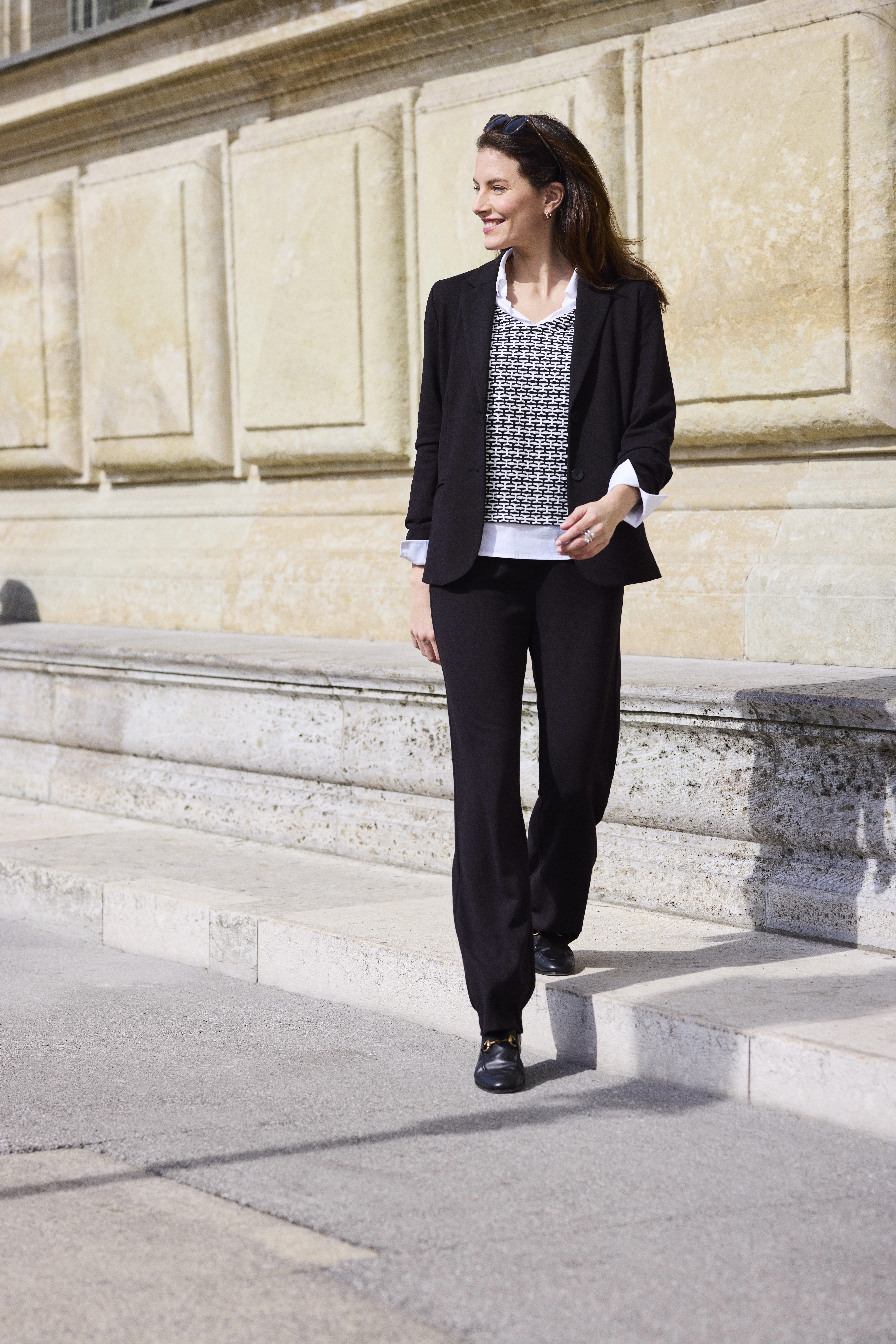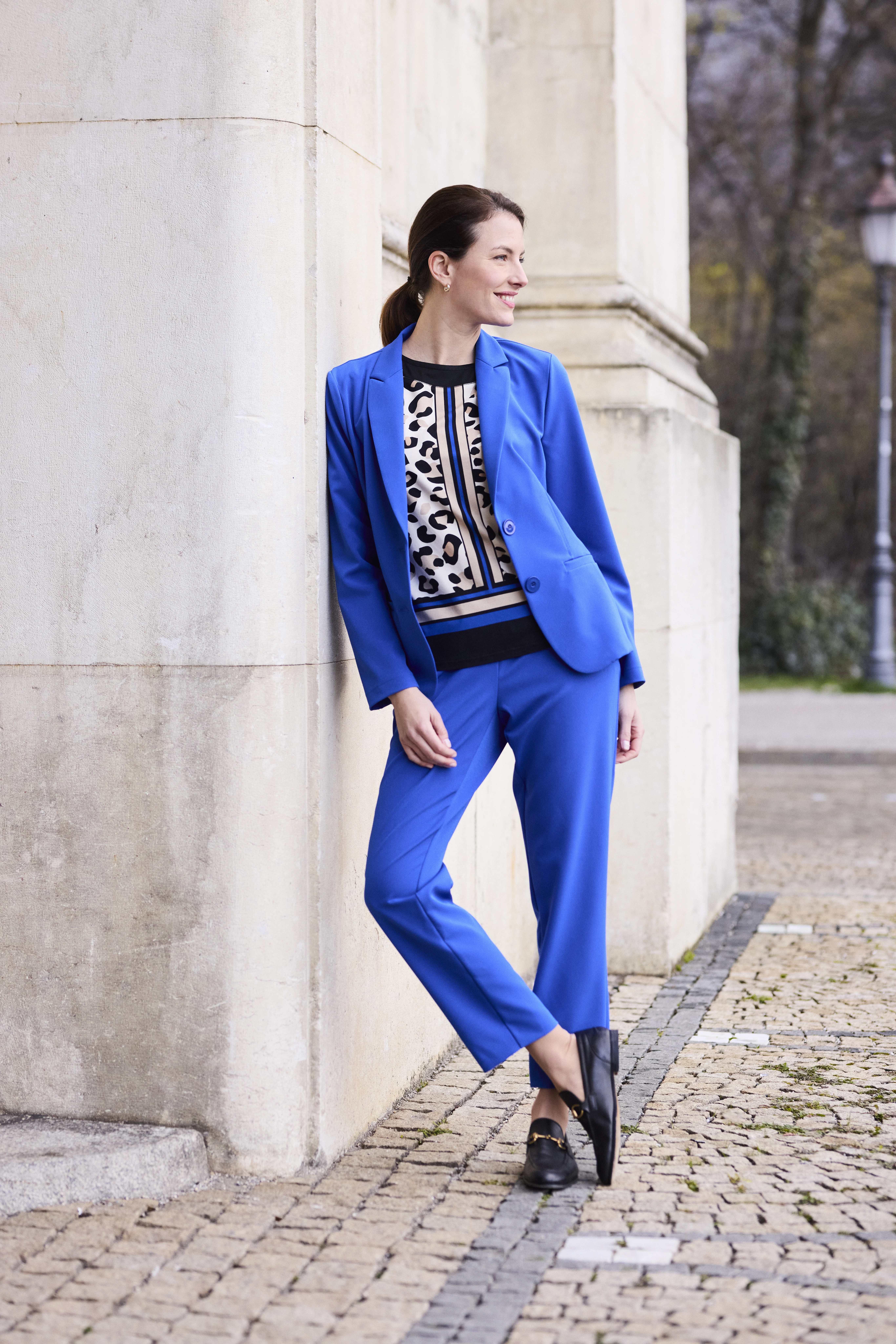Outfit-Ideen: Für Damen bedeutet der Business-Dresscode in der Regel kostümierte bzw. anzugähnliche Kleidung in gedeckten Farben. Bewährt haben sich Kombinationen wie der Hosenanzug - eine Kombination von Blazer mit passender Stoffhose - oder ein klassisches Kostüm aus Blazer und Rock in Schwarz, Grau, Marine oder Beige. Darunter wird meist eine schlichte Bluse oder ein elegantes Top getragen. Auffällige Muster oder intensive Farben werden im Business-Kontext meist zurückhaltend eingesetzt – dezente Streifen, Karos oder kleine Akzente sind okay, solange der Gesamteindruck ruhig und professionell bleibt. Geschlossene Lederschuhe sind außerdem ein Muss. Frauen tragen z.B. elegante Pumps oder flache Loafer aus Leder, anstatt Sandalen oder Sneaker.